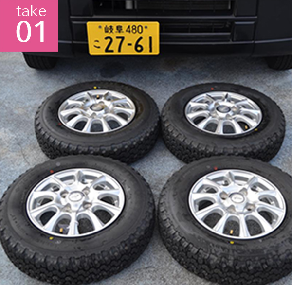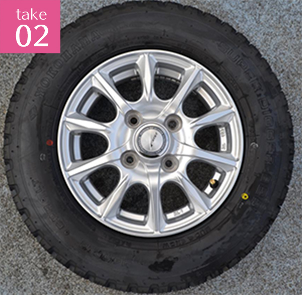 ホイールのデザインがしっかりわかるように。4本とも撮影しておく。タイヤのメーカーやサイズ、パターン名もわかるように撮影するとよい。