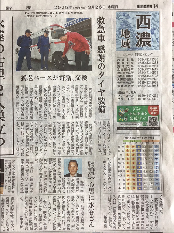 養老町の救急車全車の夏タイヤを養老ベースが寄贈しお守り致します。