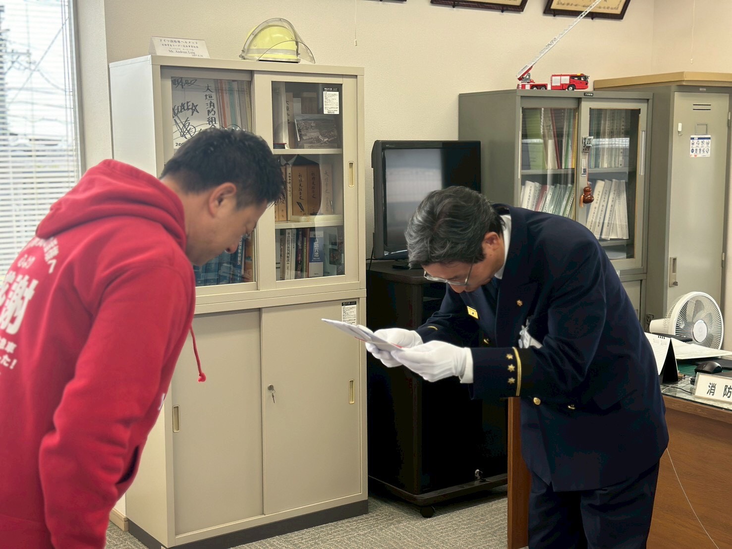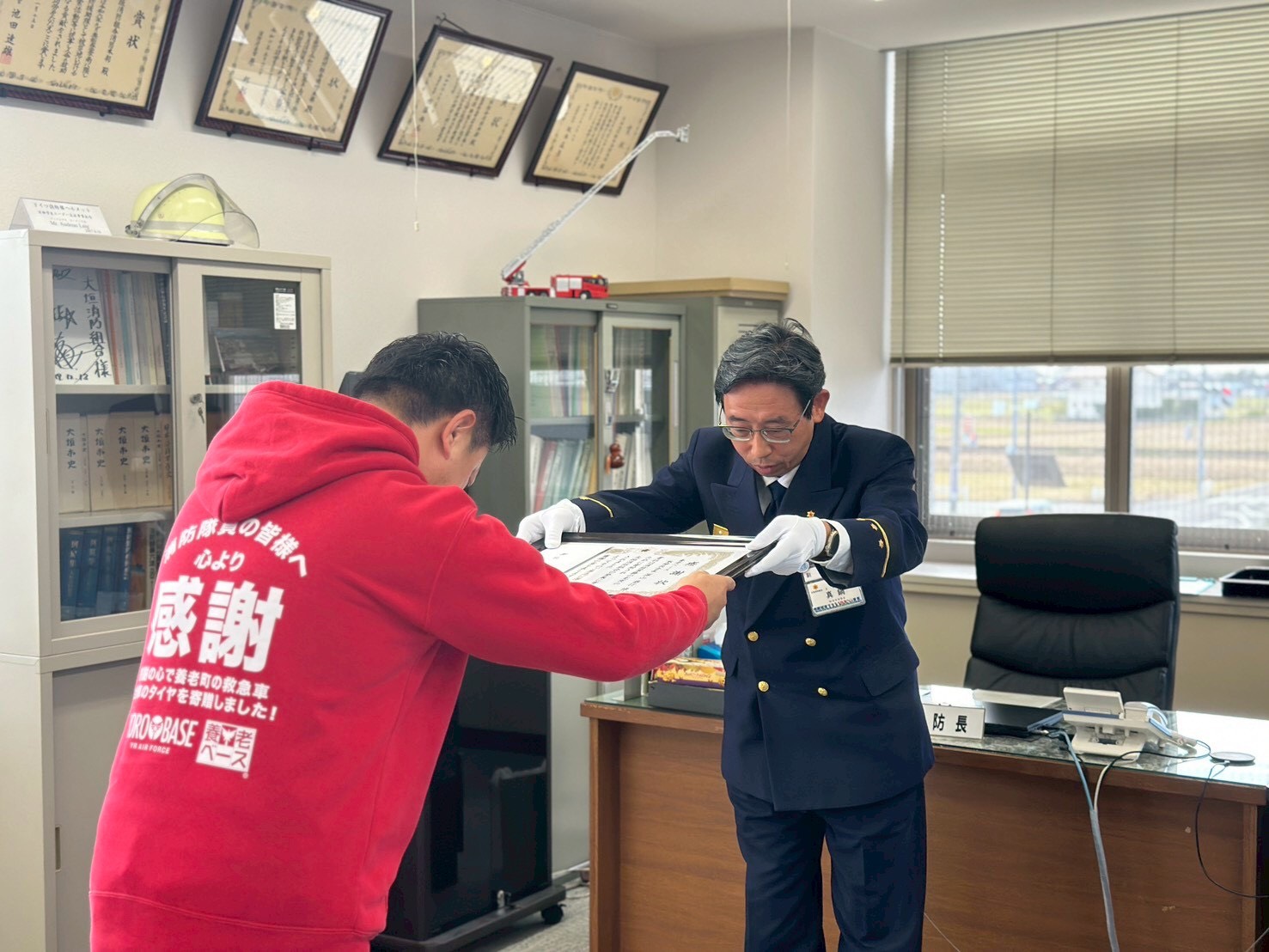 常に緊迫感ある日々の勤務に就いてくださる消防隊員の皆様へ感謝の思いを形に表わしたいと思い、この度寄付と寄贈を行わせていただきました。